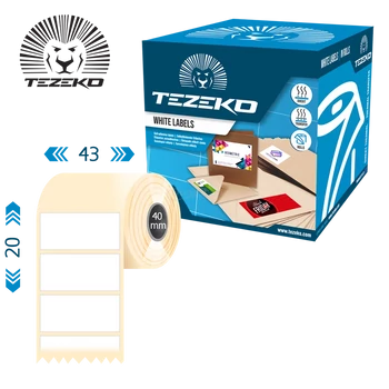 Materiál PET plast 43 * 20 mm kotúčová samolepiaca etiketa, silné lepidlo, vnútorný priemer 40 mm, vonkajší priemer kotúča pod 100 mm, 2000 etikiet/kotúč, Biely neopotlačený štítok Odolný voči poveternostným vplyvom na označovacie úlohy. Prevádzková teplota štítku: -40°C - +150°C, Teplota aplikácie štítku: +5°C Na tlač etikiet odporúčame pásku Tezeko RESIN." |